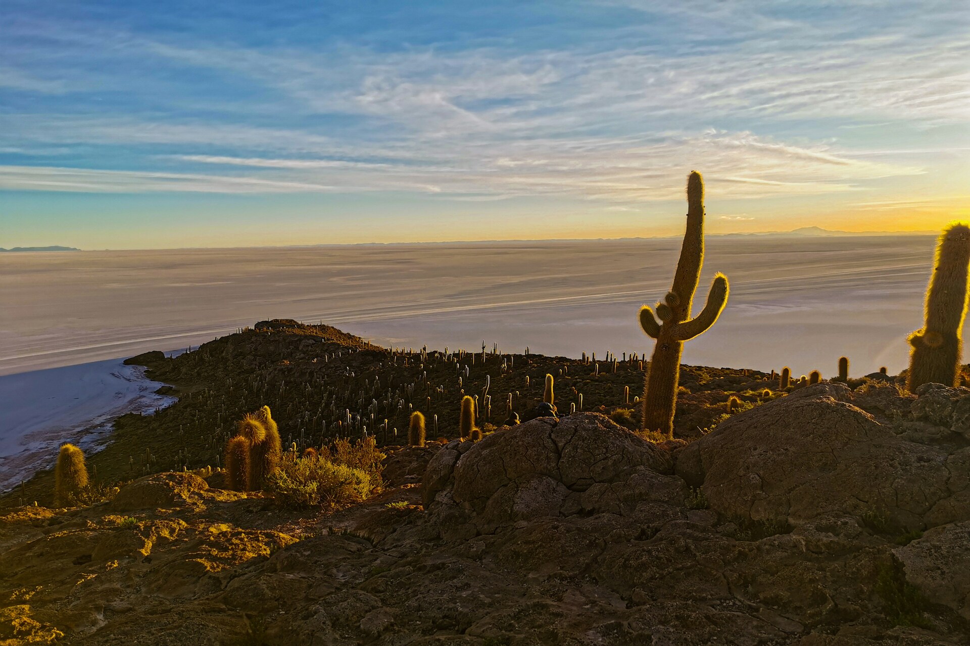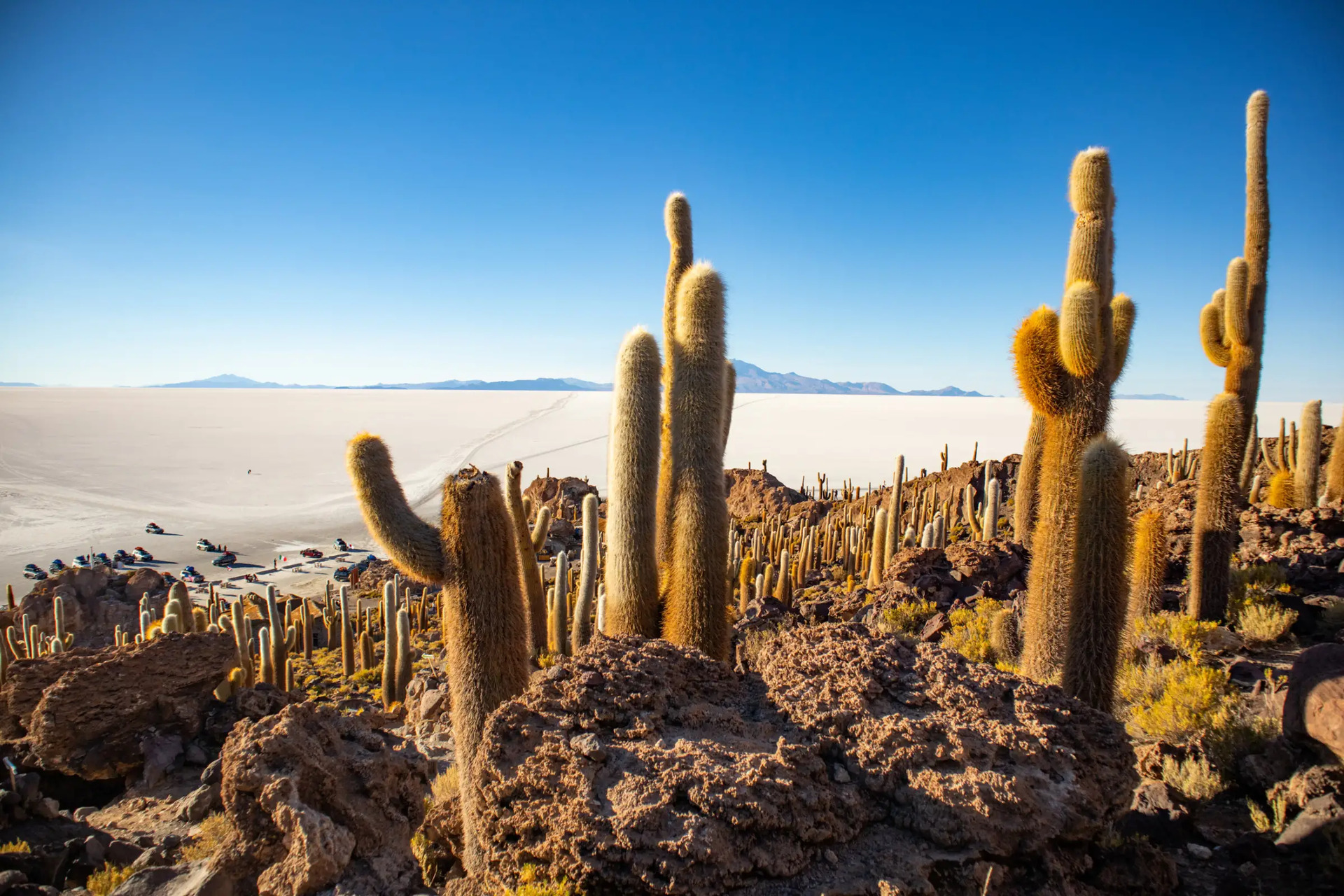 Aprofunde a exploração pelo Salar de Uyuni e descubra as suas características geográficas únicas. Durante o percurso, faça uma visita à pequena comunidade de Coquesa, situada na base do Vulcão Tunupa, na borda do salar. Caminhe até a um miradouro panorâmico sobre o deserto de sal e visite uma caverna onde se encontram múmias bem preservadas há mais de 500 anos. Prossiga até Incahuasi, uma ilha coberta por cactos gigantes Trichocereus, e desfrute do almoço rodeado pelas vistas panorâmicas do salar, aproveitando algum tempo livre para explorar a flora desértica da ilha.